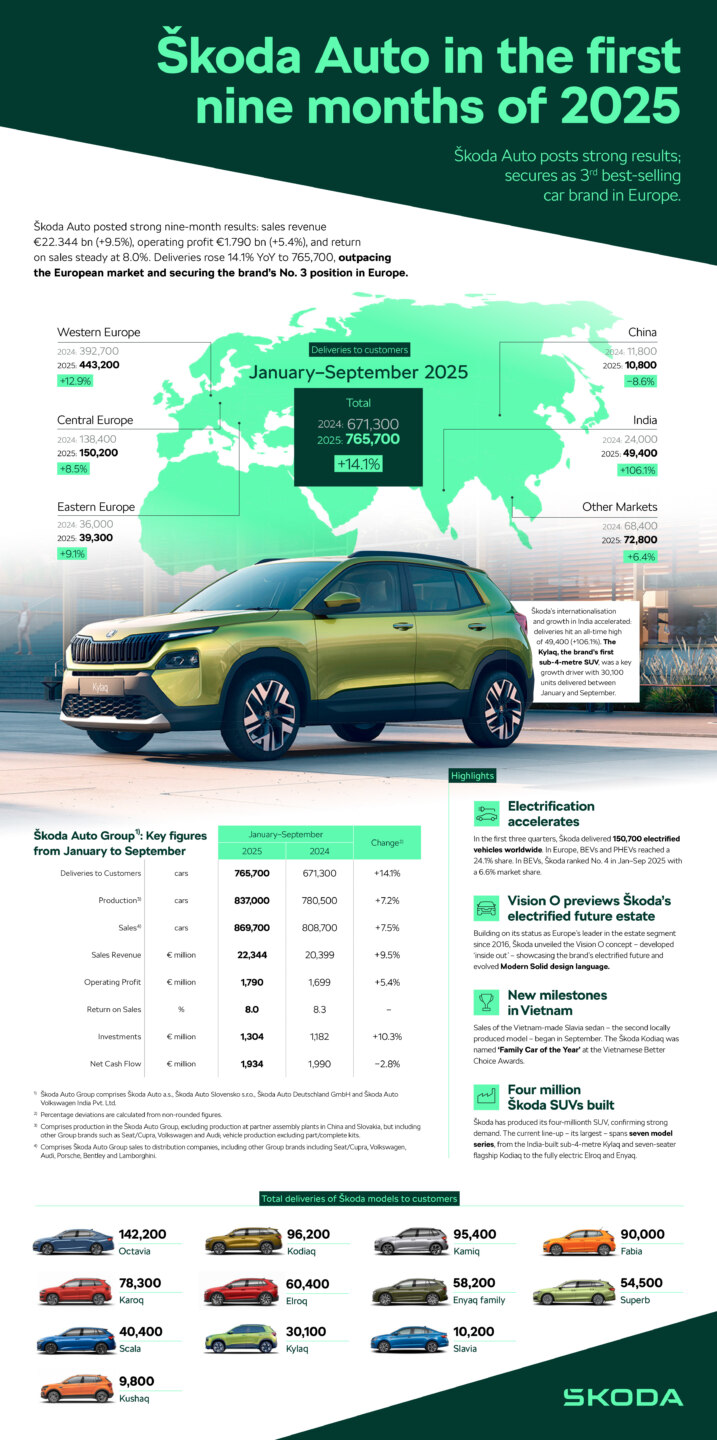 Някои SUV-ове бяха пуснати на пазара съвсем наскоро и пълният им потенциал все още не е отразен в статистиката за продажбите. Изцяло новият, изцяло електрически Elroq е на пазара от по-малко от година и вече се изкачва в класациите за продажби на електромобили в цяла Европа. Той беше най-продаваният електромобил на континента през април и юли, а до края на август бяха направени над 100 000 поръчки. Новото семейство Enyaq, представено по-рано тази година, продължава да играе важна роля за успеха на Škoda в категорията SUV. Общо производителят на автомобили е доставил 72 000 изцяло електрически SUV-а на клиенти в Европа само през първата половина на годината.