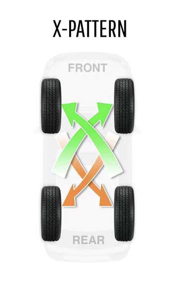 Това е най-често срещаната шарка за превозни средства с предно задвижване. Гумите на предната ос се преместват директно назад, докато задните гуми се преместват диагонално нагоре към противоположната страна на предната ос.